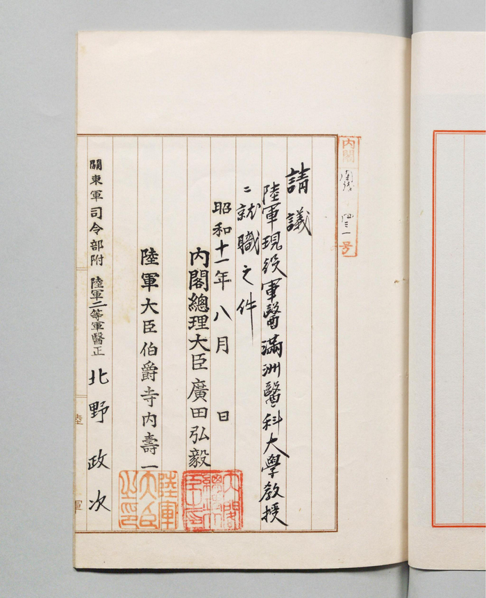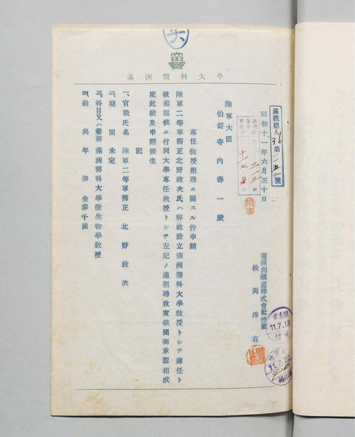 金成民表示,侵华战争期间,为进行细菌战的研究,日本的医学界和军界始终保持着密切的联系。这一点,从北野政次的履历中就可以体现出来。在就任731部队部长之前,1936年8月,北野政次曾被调往当时的满洲医科大学任微生物学教授。该校创立于1911年,是日本殖民机构“南满洲铁道株式会社”在沈阳设立的私立学校,培养了大批为日本侵略战争服务的医务人员,此次调动的相关档案文件也在近日首次公开。