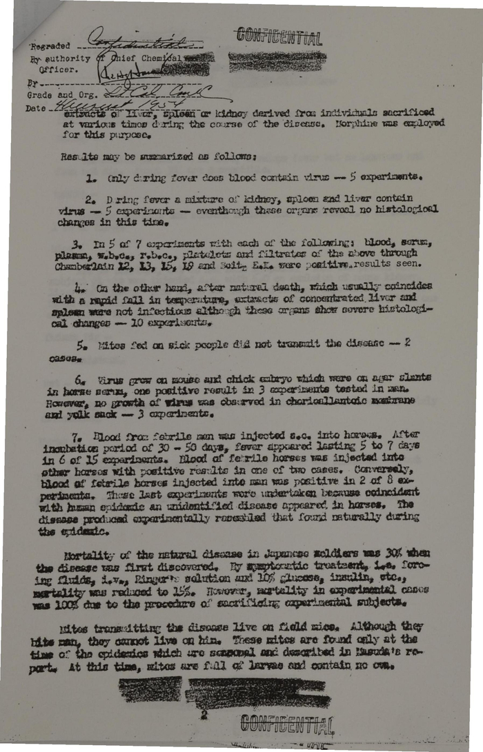 “自1942年11月开始进行人体实验,所有组织送到石川医生处……在日本士兵中,当这种自然疾病首次发现时,死亡率为30%,通过对症治疗,死亡率下降至15%。然而实验病例的死亡率是100%。”