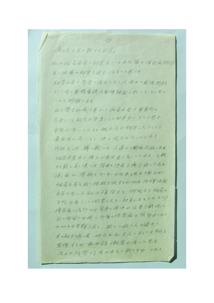 在笔供的最后,北野政次表示细菌武器是“脱离了医学的正轨,是一种逆用,违背国际人道主义,不应该使用。”并认为“应当把精力投入到传染病的预防及治疗研究中,为人类造福,意义重大。”而在现实中,北野政次的行为却完全相反。