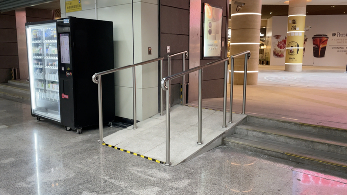 许多细节也在这个过程中被不断完善,卷帘门下拉后正好在三级台阶的中间位置,成晨和龚骏在商量过后决定将坡道的扶手制作成“二段式”,一根扶手分为两段,既不用改变卷帘门的位置,也不影响实际使用。在三处台阶中如何选择坡道的建设地点也是综合考虑到残障人士的使用体验,一来要离出入口近,二来也最接近进站闸机。“这次施工由百联世纪作为主体,后续维护和保养也将由我们负责。”龚骏说道。