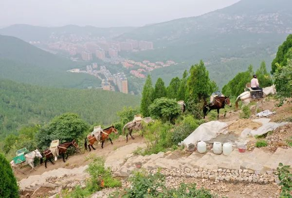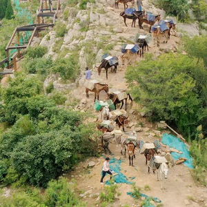 正午,一阵“哒哒哒”的蹄声从山上传来,越来越近。山体中央,有一条不规整的小路,骡子驮着两个空荡荡的筐子,排成一条长蛇,缓慢下山。人骑着骡子,穿过树丛,来到马帮短暂休整的地方,下午还要继续工作。