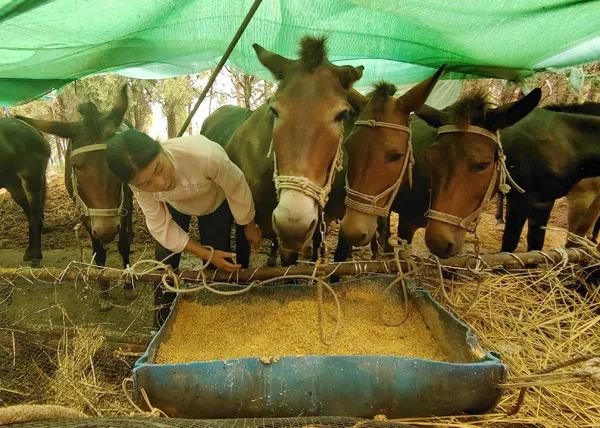 上午运料结束后,他们会把骡子拴到木桩上,喂草料