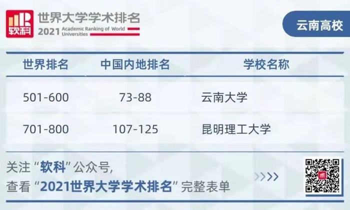 2021软科世界大学学术排名发布!云南两所高校入围!