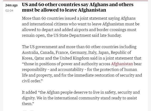 英国《卫报》刚刚消息,包括美澳加英在内超60个国家发表联合声明称,必须允许阿富汗人和其他在阿国际公民离开阿富汗。