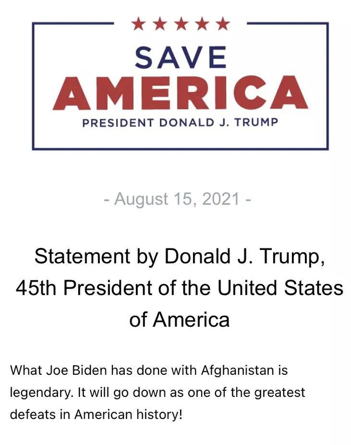 “乔·拜登对阿富汗的所作所为堪称‘传奇’,这将成为美国历史上最大的失败之一!”特朗普当地时间15日先是在一份声明中讽刺写道。