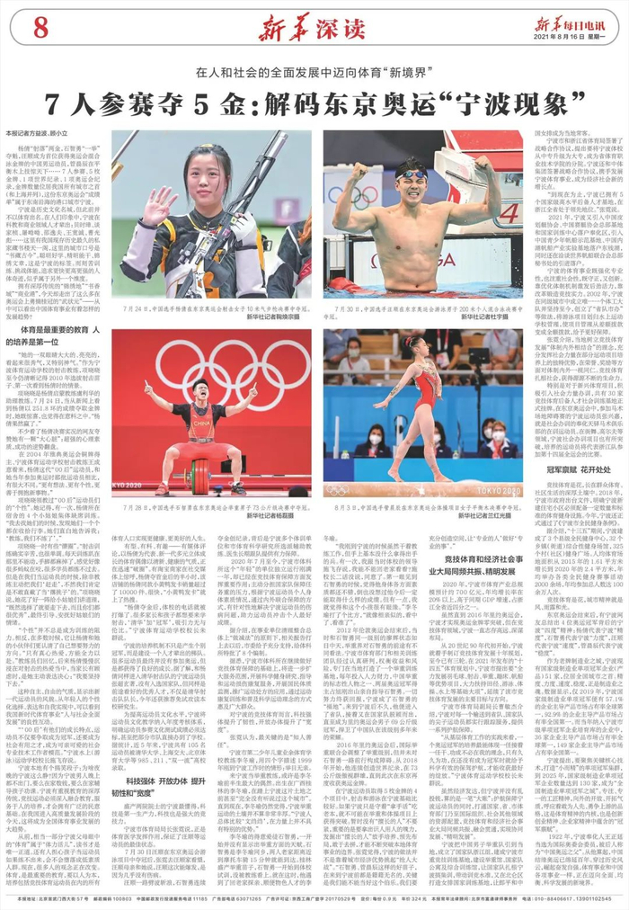 杨倩“射落”两金,石智勇“一举”夺魁,汪顺成为首位获得奥运会混合泳金牌的中国男运动员,管晨辰在平衡木上技惊天下……7人参赛、5枚金牌、1项世界纪录、1项奥运会纪录,金牌数量位居我国所有城市之首(和上海并列),这份东京奥运会“成绩单”属于东南沿海的港口城市宁波。