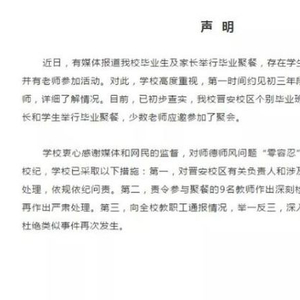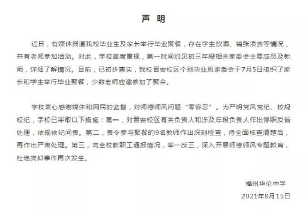 8月15日,福州华伦中学官方微信公众号发布声明表示:有媒体报道学校毕业生及家长举行毕业聚餐,学校高度重视,迅速展开调查,已初步查实,学校晋安校区个别毕业班家委会于7月5日组织了家长和学生举行毕业聚餐,少数老师应邀参加了聚会。