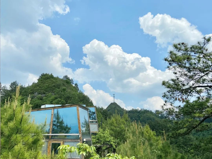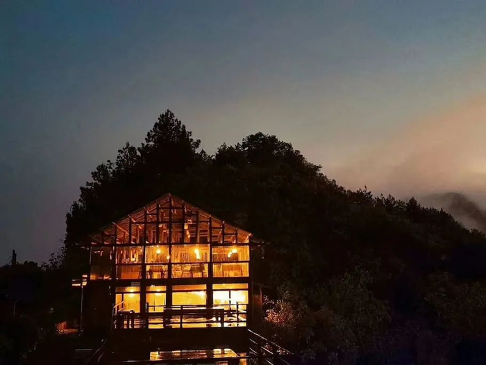 星云小屋是一座建在山脊上的山景民宿,只有12间,藏在群山翠松之间,顺着绿意葱茏的山路,踩着阳光向前,它就在道路的不远处。