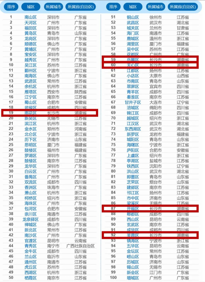 在2021年百强区榜单中,湖南入榜的5个百强区均来自长沙,分别为雨花区、岳麓区、天心区、开福区、芙蓉区,分列第19位、第59位、第60位、第87位、第92位。