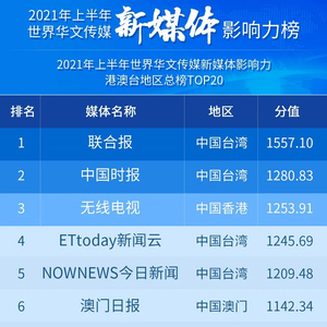 2021年上半年世界华文传媒新媒体影响力港澳台地区各项榜单的TOP20为: