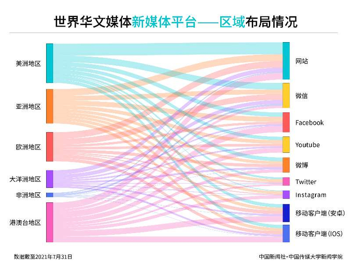 截至2021年6月30日,项目团队跟踪监测在新媒体平台上维持常态运营的华文传媒合计333家,其中港澳台地区55家、亚洲其他地区57家、欧洲地区59家、美洲地区107家、大洋洲地区40家、非洲地区17家,世界华文传媒新媒体平台布局情况以中华文化区域为中心呈差序扩散态势。