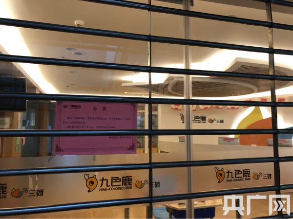 位于福州仓山区金林路和鼓楼区三荷校区的九色鹿培训学校,目前两个校区都已处于关门停课状态。央广网记者在九色鹿三荷校区看到,该校区铁栅门紧锁,并贴出了“放假期间校区无工作人员”的公告。