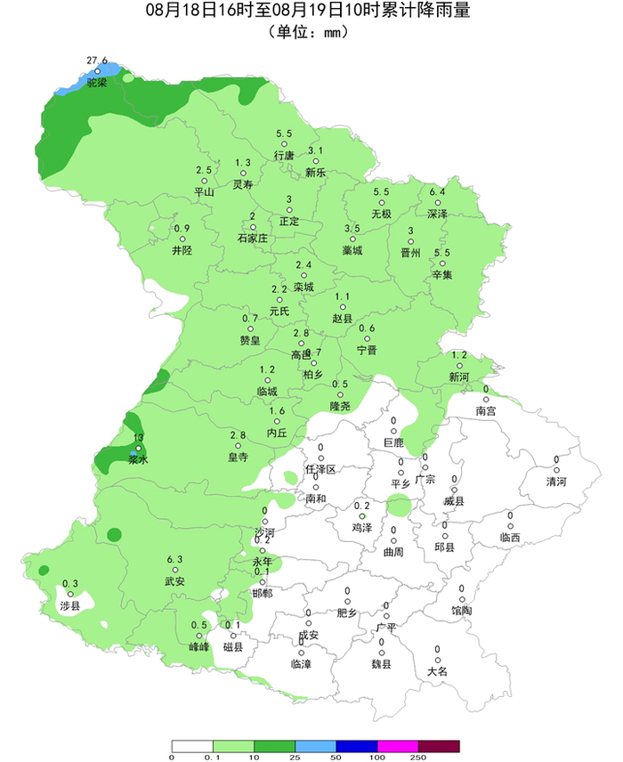 长城网讯(记者 刘俐验)邢台市气象台8月19日10时发布天气实况和预报信息:18日16时~19日10时,邢台市西部、北部地区出现降雨,降雨区平均降雨量3.5毫米,10毫米以上17站出现在信都区、内丘、临城,最大信都区前南峪33.3毫米,最大小时雨量信都区前南峪22.5毫米(18日18:00~19:00)。预计未来3小时邢台市中西部地区有阵雨。
