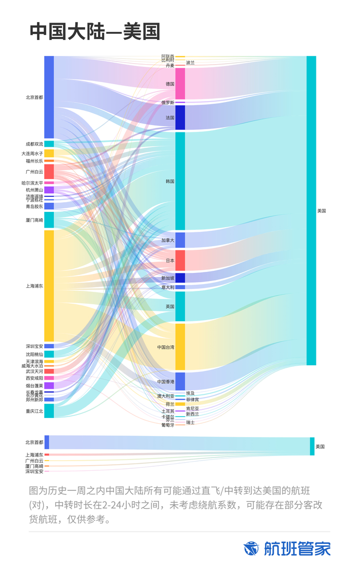 据航班管家的统计数据,上周,中国大陆往返美国直飞航班共计42架次,出发机场主要分布在北上广一线城市和福建厦门,包括北京首都、广州白云、厦门高崎、上海浦东、深圳宝安几个机场,其中北京首都出发航班最多,占比76.19%;此外,上周中国大陆所有可能通过中转到达美国的航班数为8962,其中通过韩国、中国台湾、法国、德国中转到达美国的航班最多,占比总数的33.88%。