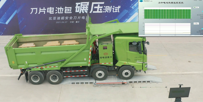 刀片电池包经实测,在承受重达46吨的重型卡车碾压后无明显变形,无烟无火,重新装车后车辆仍可正常行驶。