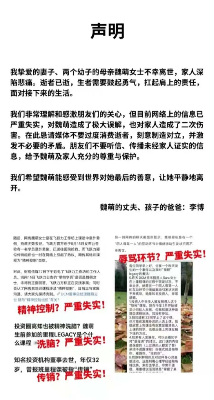 对此,LEGACY在18日声明中转发“魏萌家属朋友圈声明”。“家属声明”称,此前关于课程中存在“精神控制”“洗脑”“传销”“辱骂环节”等内容严重失实。LEGACY也表示,将与家属一致,对不实报道采取一切必要的法律手段予以维权。
