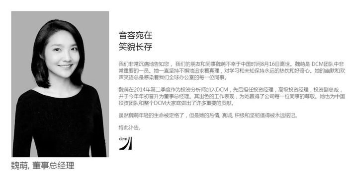 8月18日,DCM官网发布了关于魏萌去世的讣告。