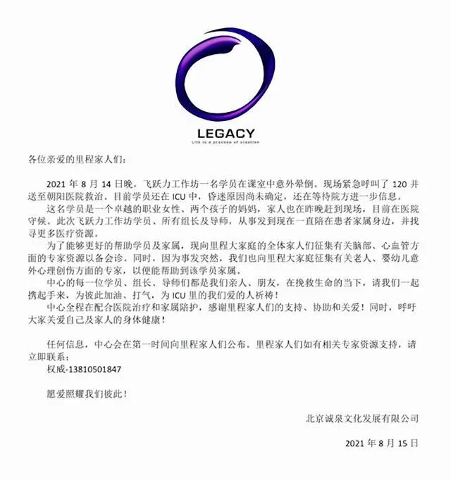 中新网注意到,8月15日,LEGACY的官方公众号曾发布过一则求助信。求助信中称,14日晚,飞跃力工作坊有一名学员在课室中意外晕倒,现场紧急呼叫了120,送至朝阳医院救治。同时,“征集有关脑部、心血管方面的专家资源以备会诊。”