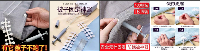 把被子四个角和四条边动态持续地固定在被套里,是每一位 “强迫症” 盖被子时最大的愿望吧。我在网上发现(当然更可能是商家按我的喜好推送的)一种硅胶扣,把衬衫扣子大小的两个扣放在被套外面,中间一条塑料绳穿过去固定被子,绳两端的T字头卡在扣子上。我认真看了视频,觉得这就是新一代颠覆性产品,下了单,用了优惠券,只花了不到10元。