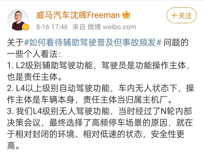 此外,威马汽车创始人沈晖于8月16日在其微博,就关于“如何看待辅助驾驶普及但事故频发"问题分享了一些个人看法: