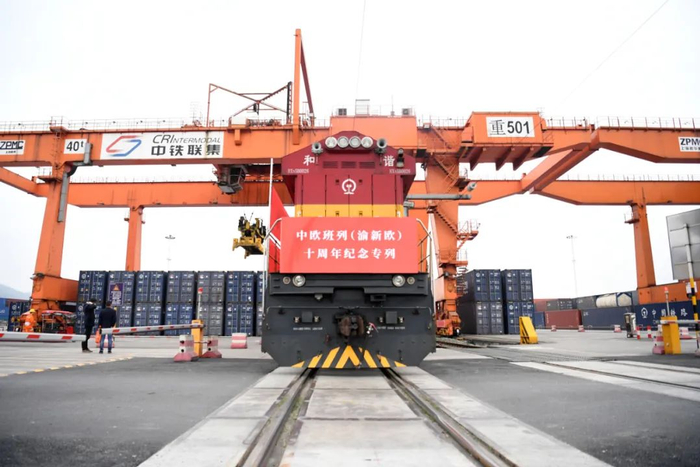 3月19日,中欧班列(渝新欧)十周年纪念专列在重庆团结村站等待发车。新华社记者 唐奕 摄