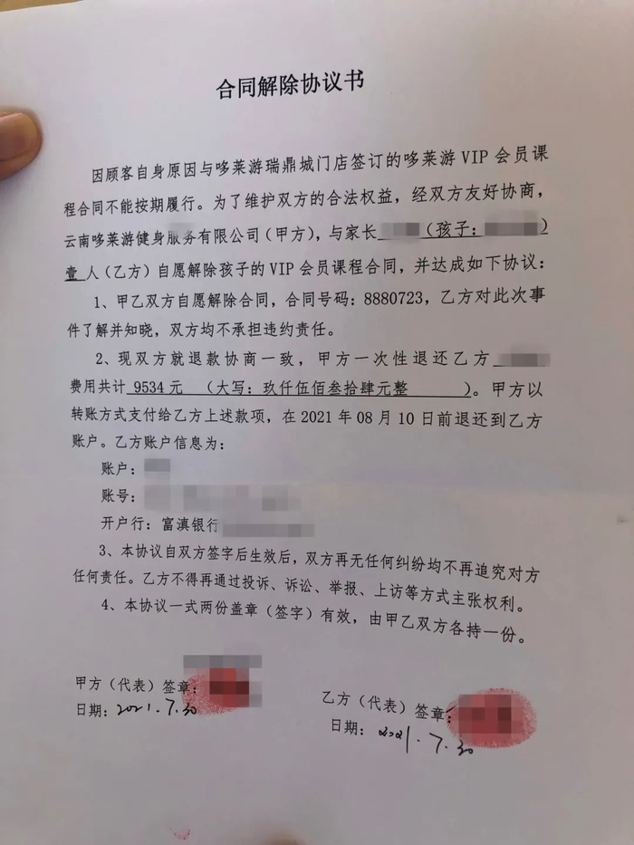 7月22日,该游泳馆一位万姓财务负责人以财务流程需要为由,让陈先生退还当时的培训合同(买课时所签的合同)。7月23日,陈先生按照约定,到瑞鼎城门店退还了这份合同。“当时跟我协商的游泳馆负责人承诺,7月26日一定能把款退给我,并和我签署了第二份退款协议,明确注明于2021年7月26日20点前退还款项。”陈先生说。