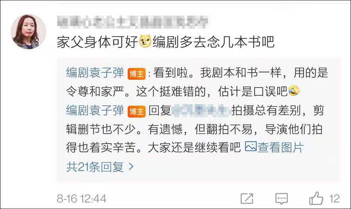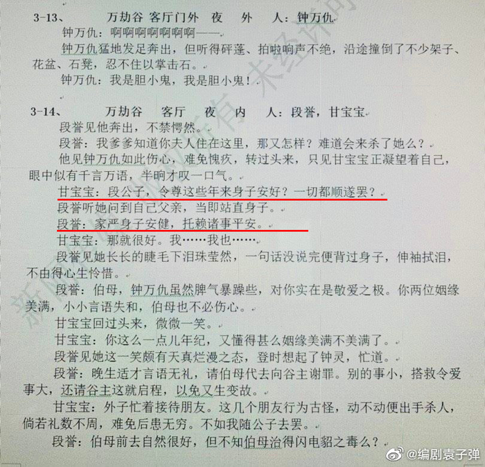 雷人台词被网友疯狂吐槽后,最新版《天龙八部》编剧袁子弹在微博晒出原本剧本,表示自己的剧本和书一样,用的是“令尊”和“家严”。