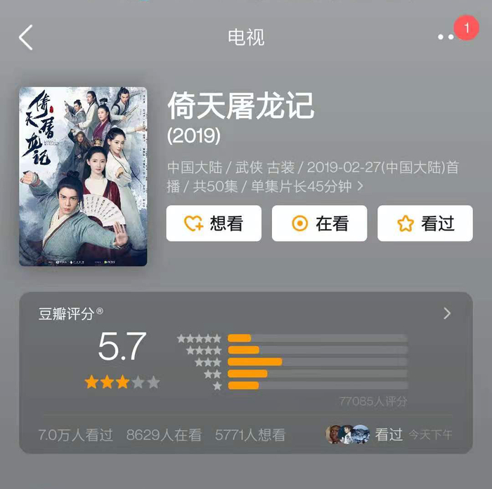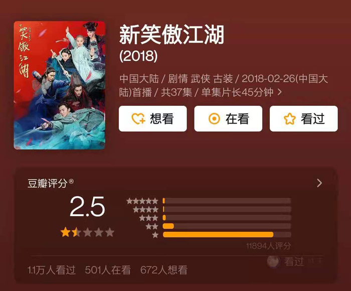 这版《天龙八部》之前,钟汉良版本就已大获差评,评分仅4.5;于正版《神雕侠侣》4.9;《倚天屠龙记》2019年版本评分也未能及格;最新版的《笑傲江湖》更是只有2.5分;更不用提去年被群嘲的张一山版本的《鹿鼎记》。