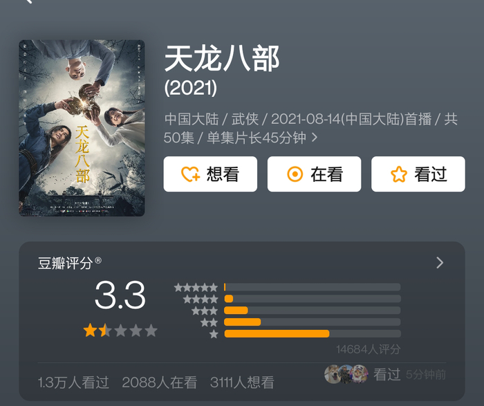自8月14日开播以来,新版《天龙八部》已经雷倒了万千观众,昨天(18日)在豆瓣平台开分3.6,还一度跌到3.3分,现在稳在了3.4分,仅比去年辣眼睛的《鹿鼎记》高0.2分,在所有版本中,评分最低。
