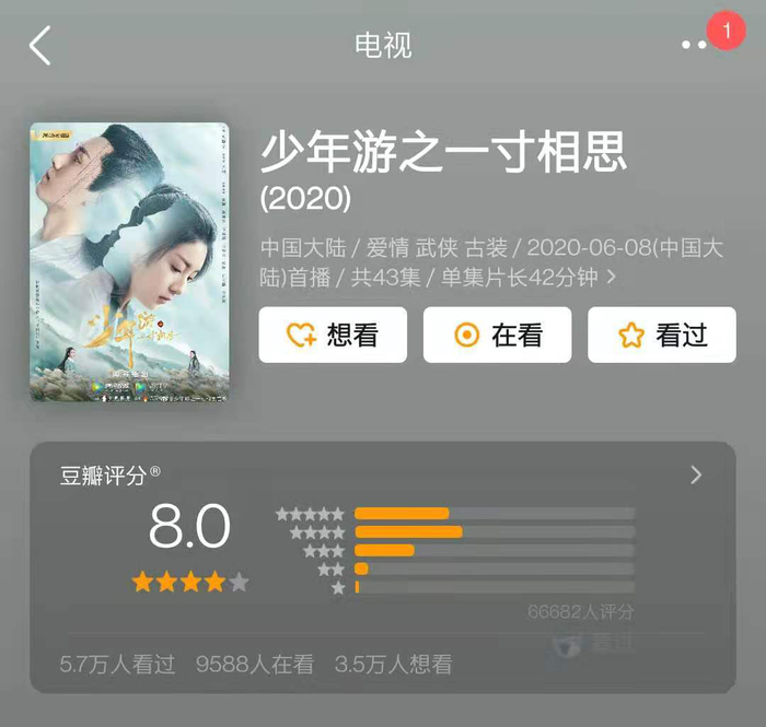 与此形成鲜明对比的是,稍稍用心的原创武侠剧近几年却掀起了一点浪花,仅在去年,就先后有《侦探简不知》和《少年游之一寸相思》两部武侠剧口碑不俗,豆瓣评分均达到了8.0分。