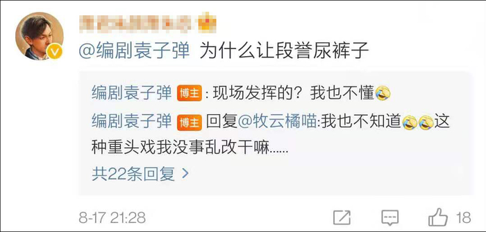 至于段誉初遇王语嫣尿裤子的桥段,袁子弹回应网友时说道:“现场发挥的?我也不懂。”