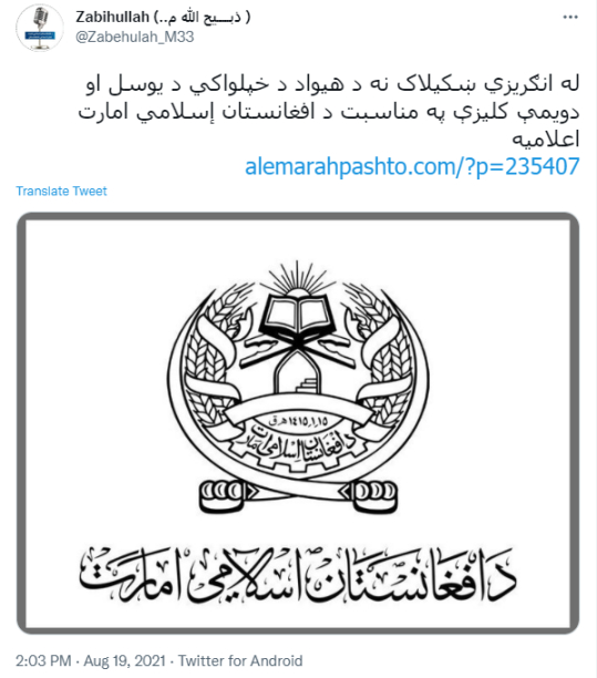 当地时间8月19日,阿富汗塔利班发言人扎比胡拉·穆贾希德在社交媒体推特上发表声明,在阿富汗脱离英国统治、独立102周年纪念日之际,塔利班宣布成立“阿富汗伊斯兰酋长国”。报道称,穆贾希德在推文下,还配了一张图片,发布了新政府”国旗“样式,酋长国的旗帜上印有国徽。