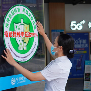 在河池市金城江区,移动营业厅工作人员正在张贴由当地新冠肺炎疾控工作领导小组认证的“疫苗接种率已达90%”标识(央广网发 中国移动广西公司供图)