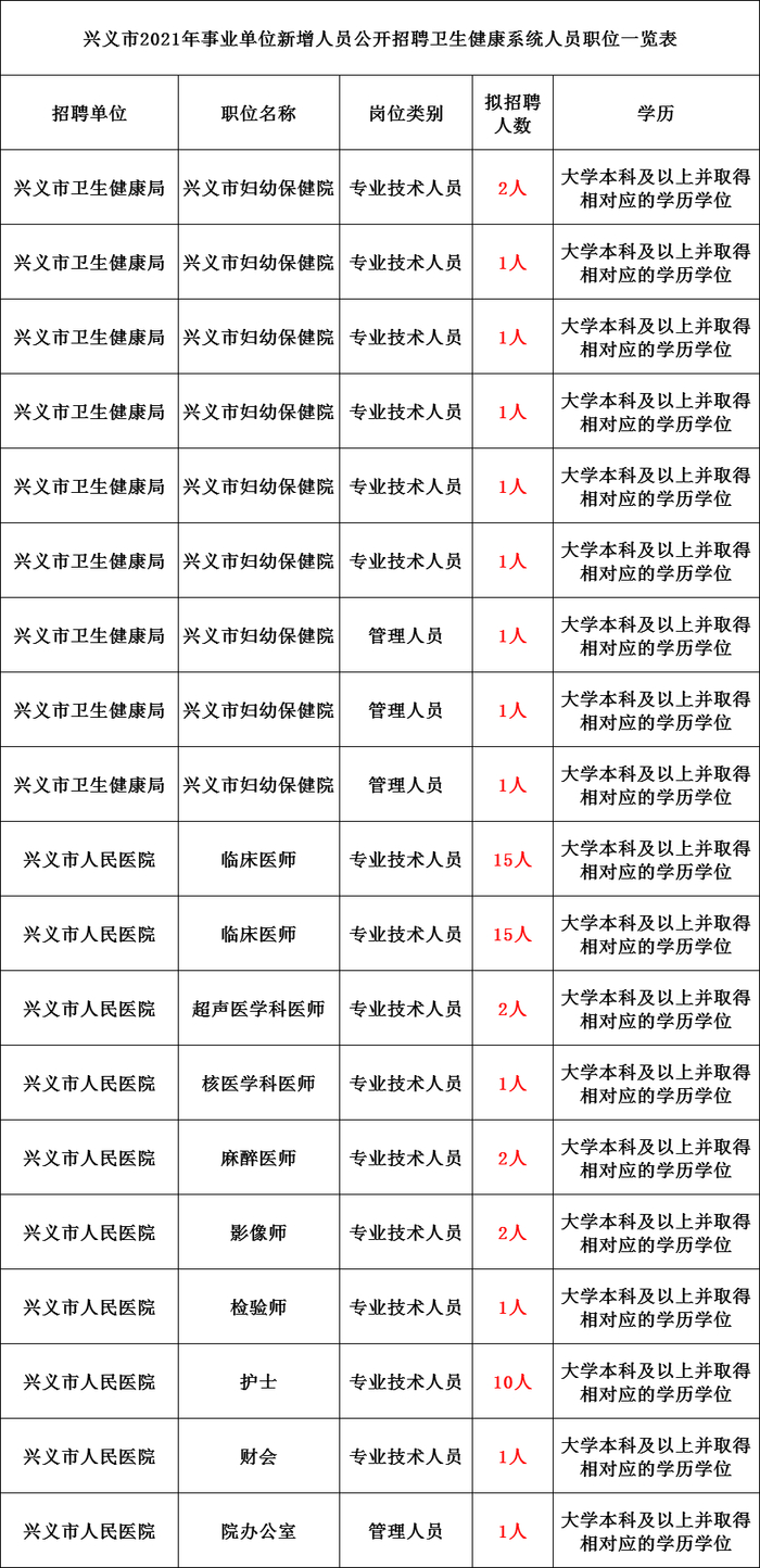 3.兴义市2021年事业单位新增人员公开招聘卫生健康系统职位一览表点击获取
