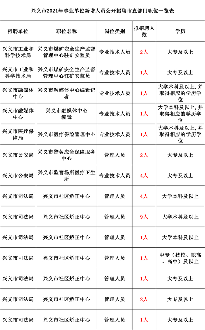 具体招聘岗位及要求详见《兴义市2021年事业单位新增人员公开招聘市直部门职位一览表》(附件1),《兴义市2021年事业单位新增人员公开招聘教师职位一览表》(附件2),《兴义市2021年事业单位新增人员公开招聘卫生健康系统人员职位一览表》(附件3)以下简称《招聘职位表点击获取》。