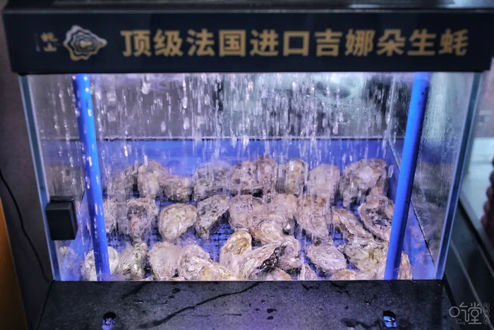 这口价值上万元的缸是专为法国进口0号吉娜朵生蚝打造的,3摄氏度恒温+模拟当地海水环境,保证了每一只吉娜朵在打开食用时,都保有着一如在法国的鲜活与口感,也算是不负它“生蚝里的劳斯莱斯”的声名了。