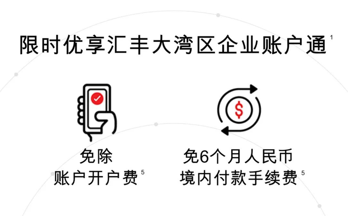 5. 凡通过汇丰中国大湾区微信小程序预约并成功开立企业账户,可在活动期间免除账户开户费。开户后免6个月经电子渠道提交的人民币境内付款(单笔付款)手续费。活动期间自2021年4月14日起至2021年12月31日止。