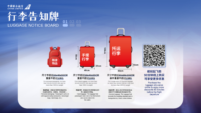 据介绍,新版行李规定操作性更强,价格设计也更为人性化。旅客可通过机场柜台、中国联合航空官网、APP、M网、微信公众号购买行李额。在航班计划起飞90分钟截止前通过线上渠道购买还可以享受优惠价格。