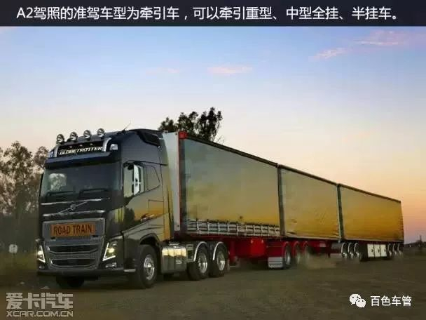 A2证的准驾车型为牵引车,可以牵引重型、中型全挂、半挂车。挂车分为两种:全挂车和半挂车,挂车总重量由其自身承受的称为全挂车、挂车总重量的一部分由牵引车承受的称为半挂车。