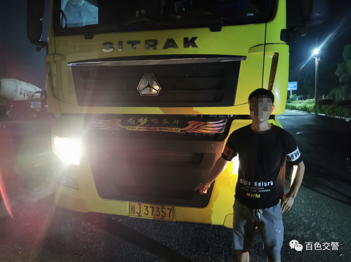 百色市公安局交警支队直属二大队民警前往协助处置。经核查,发现驾驶人冯某生持有B2驾驶证,但其驾驶的却是重型半挂牵引车(需A2驾驶证),与其准驾车型不符,冯某生涉嫌驾驶与驾驶证载明的准驾车型不符的机动车。