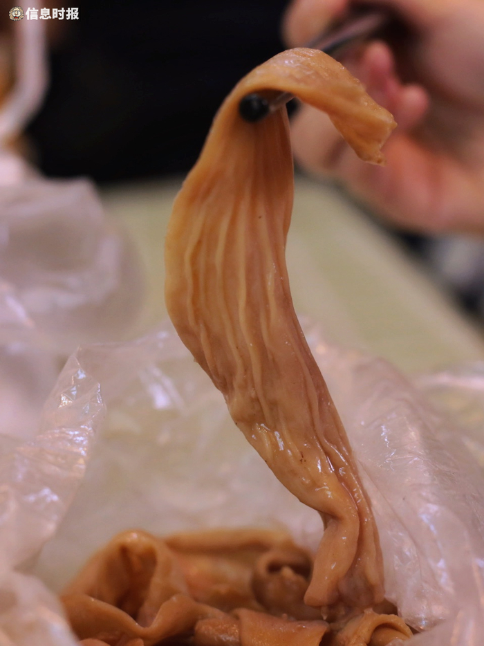 更为矜贵的是卤水鹅肠,仅在周日中午12点左右开售。“懂得掐点来买它的,基本都是老熟客了。”正在排队的街坊笑着说。陈仔卤水鹅肠的特点是又宽又长,夹起来长长一条,不像是在吃鹅肠,倒像是在吃河粉。鹅肠里的油脂处理得非常干净,卤水味调得颇为清淡,能让人吃出鹅肠的鲜味。40元/斤的卤水鹅肠,不少顾客一买就是两斤起,不足半小时鹅肠已被沽清。