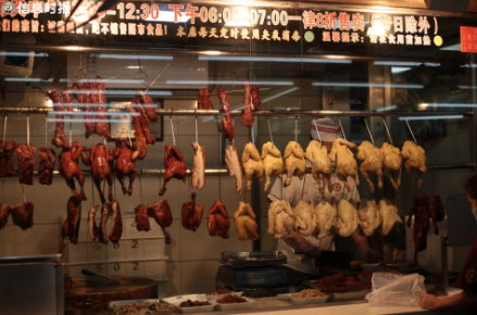 买条叉烧或者斩只下桩烧鹅、斩半只鸡加鎹,是广州人的日常事。早上10时许,老城区的菜市场人来人往。四周都是亮堂堂的灯光,被暖黄色灯光笼罩的烧腊店里,一只只还冒着热气、滴着鹅油的烧鹅,一排排油光晶亮、挂着蜜汁的叉烧,显得格外地诱人……