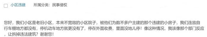 我们小区是老旧小区,本来不宽敞的小区院子里,还有户主违法建的小房子,我们连放自行车棚的地方都没有,停机动车的地方就更没有了。车停在外面收费,停在里面没地方。像这种情况,我该向哪个部门反应,拆掉违法建筑呢?