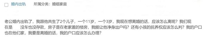 老公婚内出轨了,我跟他共生了两个儿子,一个11岁,一个3岁,我现在想离婚的话,应该怎么离呢?我们现在是没车也没存款,房子是在老家盖的楼房,我能让他净身出户吗?还有小孩的抚养权应该怎么判?我的户口也在他们家,我要是离婚的话,我的户口应该怎么办理?
