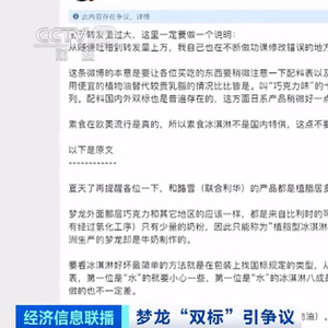 近日,联合利华公司旗下的冰淇淋品牌梦龙在社交媒体上被网友质疑中外用料不同,相关话题引发热议,一度登上微博热搜。(配料“双标”?“梦龙”冰淇淋惹众怒!)