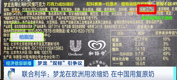联合利华:梦龙在欧洲用浓缩奶 在中国用复原奶