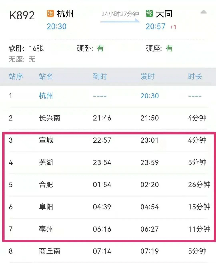 k892次列车19:15从杭州始发,21:02到终点站大同,历时25小时47分,全程共有25个停靠站,其中安徽境内站点有宣城、芜湖、合肥、阜阳、亳州。