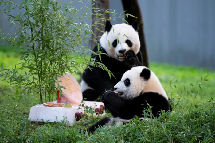 8月21日,在美国华盛顿史密森学会国家动物园,大熊猫“小奇迹”(左)和妈妈“美香”享用水果冰蛋糕。新华社记者 刘杰 摄