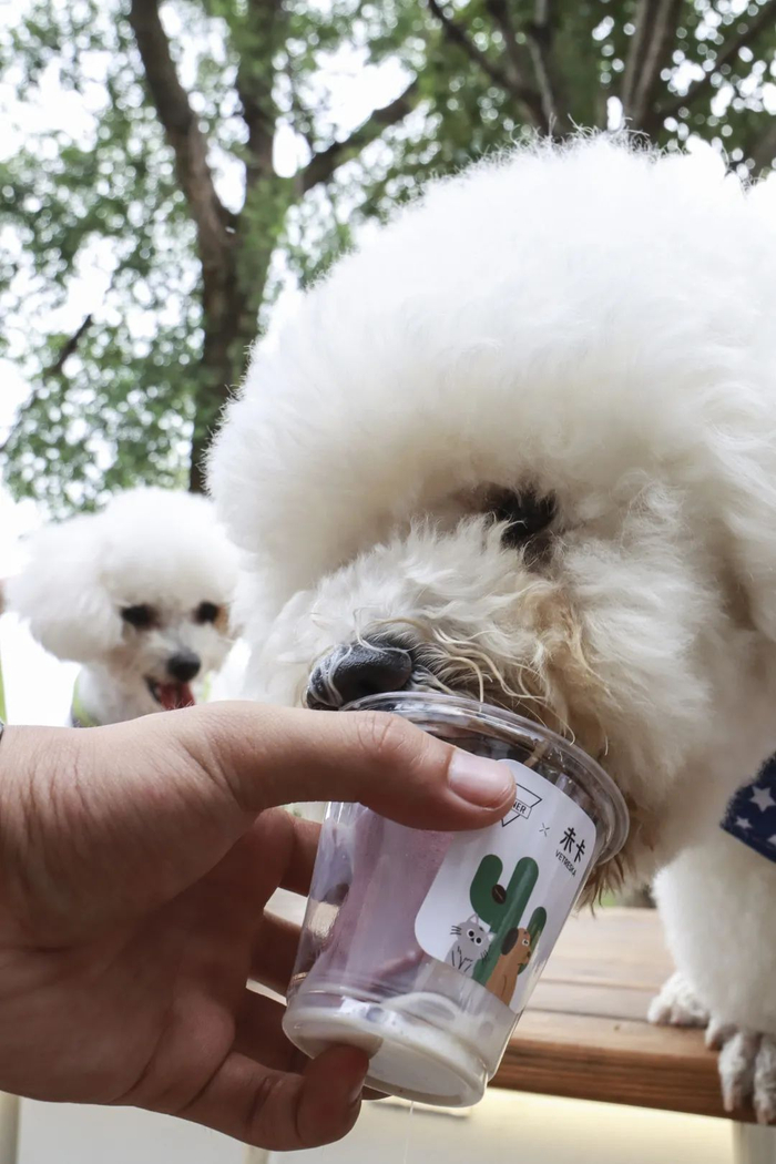 带着宠物前来的顾客不光可以领到宠物奶油,还可以给狗狗来一杯羊奶,更有狗爪形状的宠物冰淇淋免费提供。