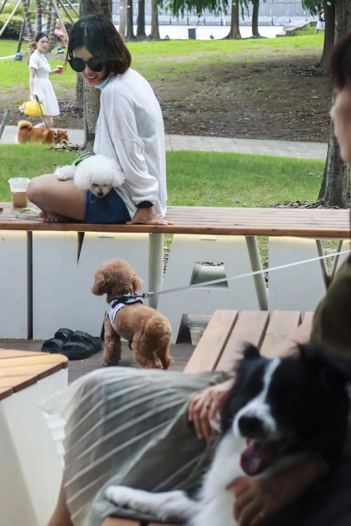 室外区域是遛狗人士和撸狗人士的专属社交区域,周五下午3时,店外坐满了遛狗的人。有顾客对工作日下午的人流量难以置信,询问店员什么时候人会比较少,答复是:只有工作日上午8时到11时一般比较空,有时候下暴雨都难挡来打卡的年轻人。